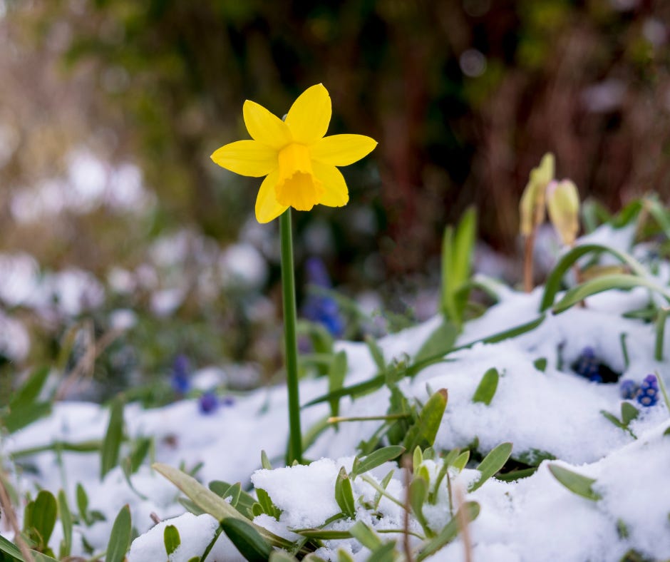 A log crackles and falls into the fire as I gently open my front door. The robin, my early visitor is waiting, and I scatter seed on the doorstep. As he swoops down a gust of icy wind reminds me of Winters presence. I look the other way and see the line of daffodils, not yet open but a yellow promise, like the sun, a reminder that Spring, with her light step and green rich cloak will come and her footsteps will warm the earth’s soil.
