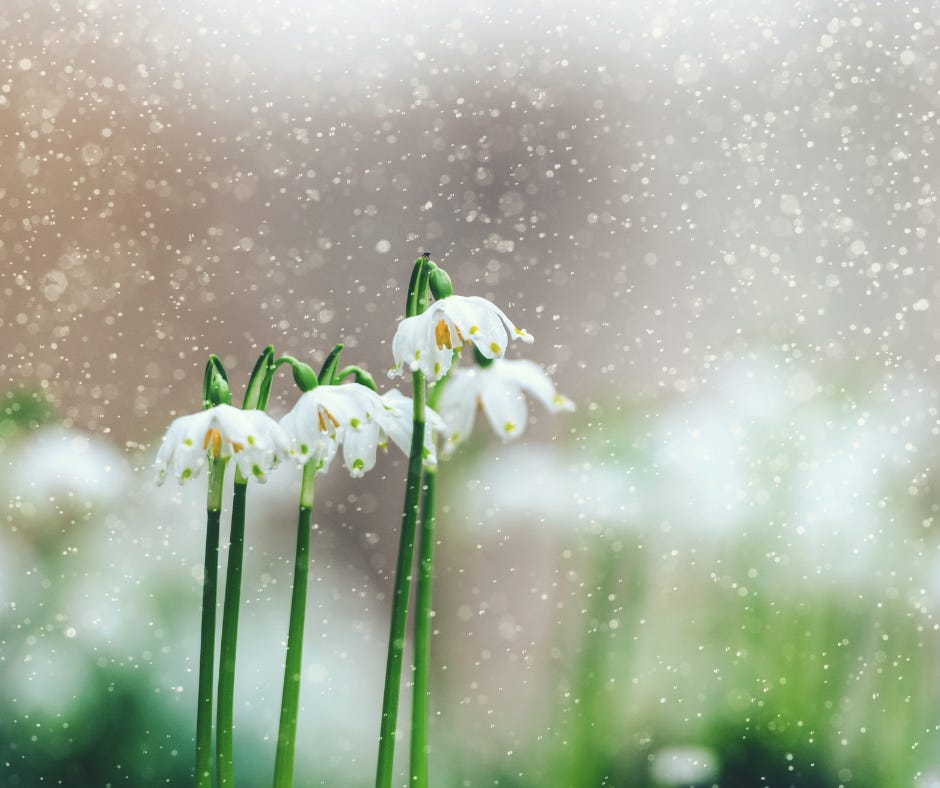 Rain is falling; it travels down the windowpanes; it falls into puddles and on the soft leaves of the fir tree standing outside my front door. Daffodils, newly opened sway gently and snowdrops pause, like little lanterns held up within the dark.