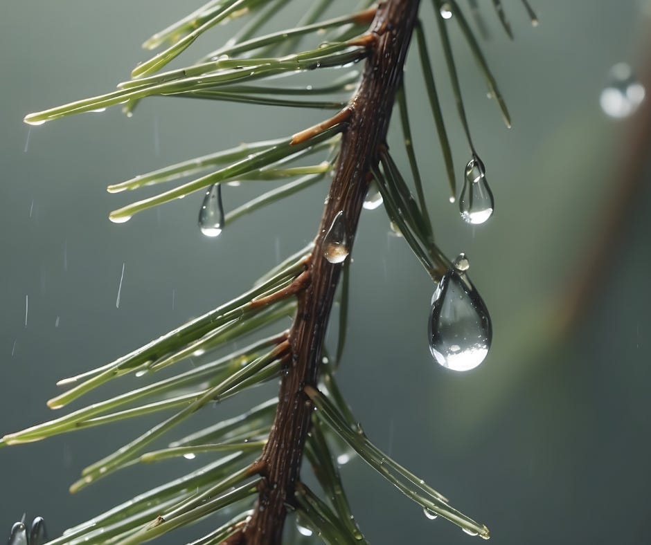I carry my tea to the window and look across at the fir tree and marvel at its ability to just be. Droplets of water glisten at the edge of pointed leaves like glimmering faraway lights and the damp bark is a smell of old, reminding me of forests long ago, of land covered in leaves, of wolves and full, round moons.